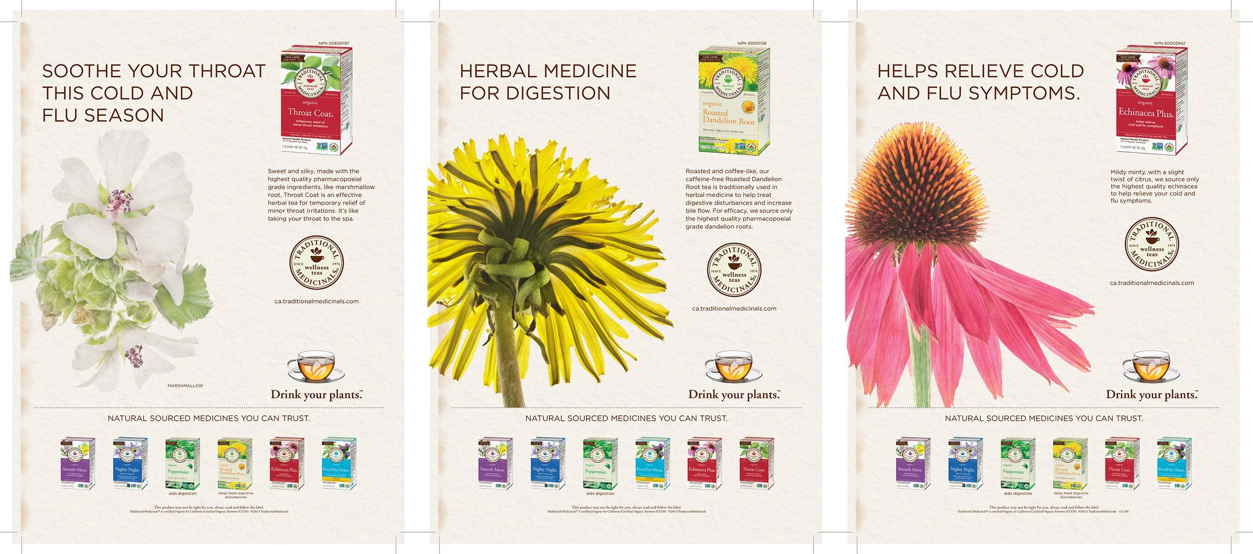 Website Visuals and Digital Assets: Created rotating homepage banners and carousel sliders for traditionalmedicinals.com, establishing an engaging online presence. Developed background imagery, headers, and promotional touts to enhance the brand's new website, and followed brand guidelines closely to craft web banner ad comps for the Dandelion Root Tea campaign.